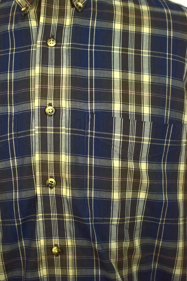 Cotton/Polyester blend Blue, brown, beige checkered shirt with single pocket to chest