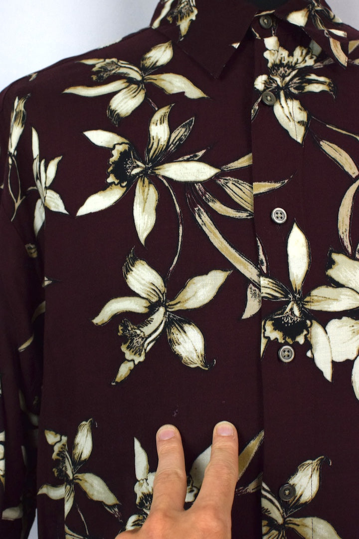Dark maroon 100% rayon shirt with floral leadf print all over