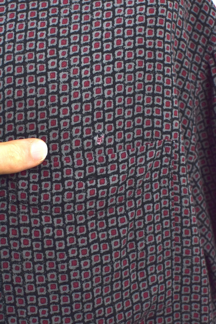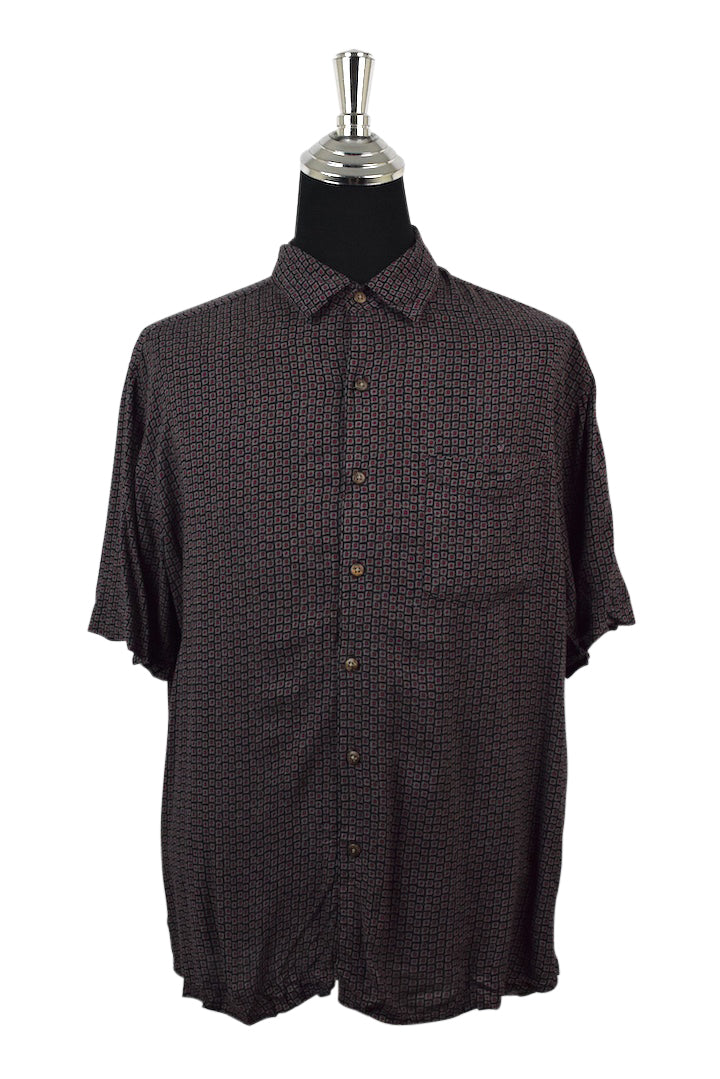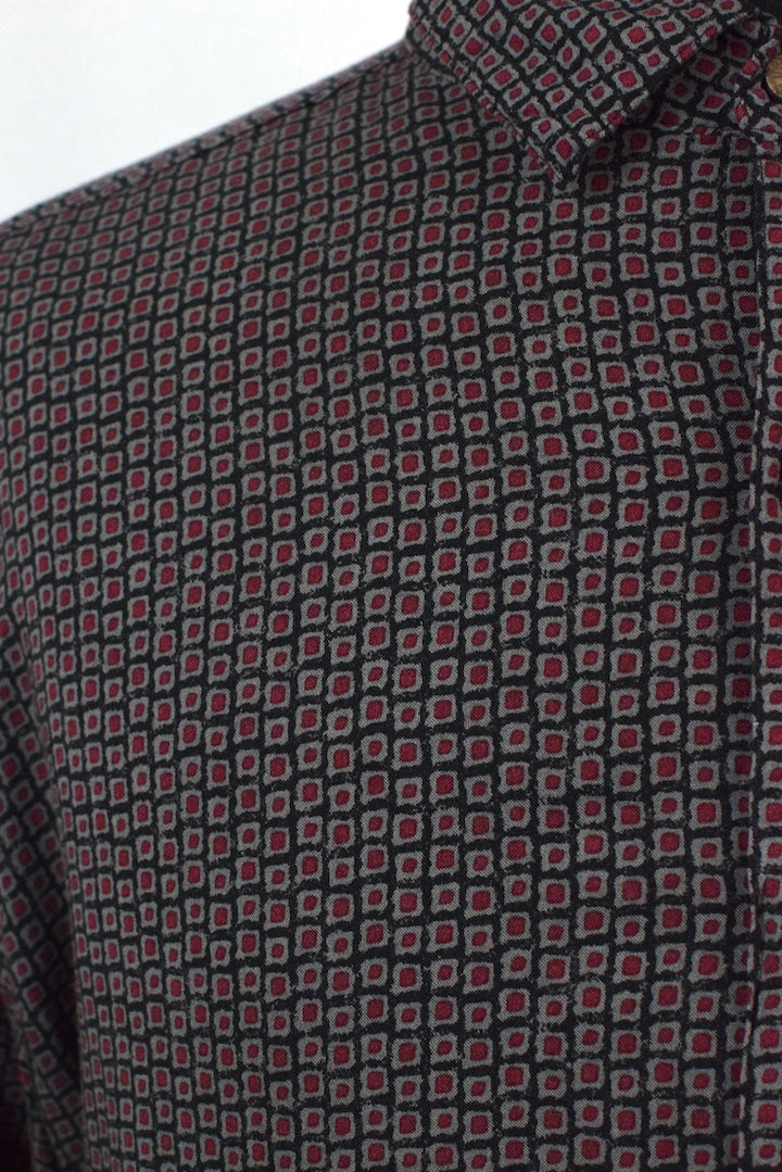 Black 100% rayon shirt with a red square tile print