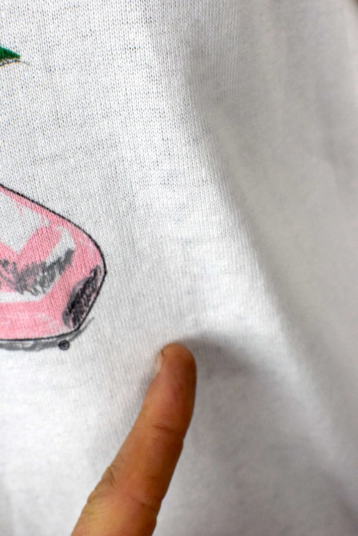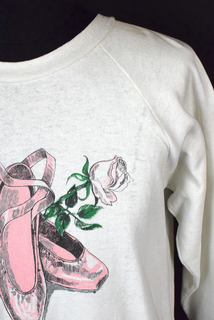 White sweatshirt with drawing style ballet slippers, rose print to front