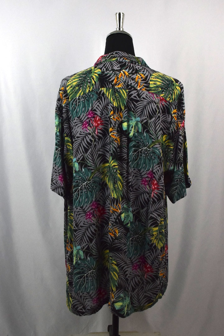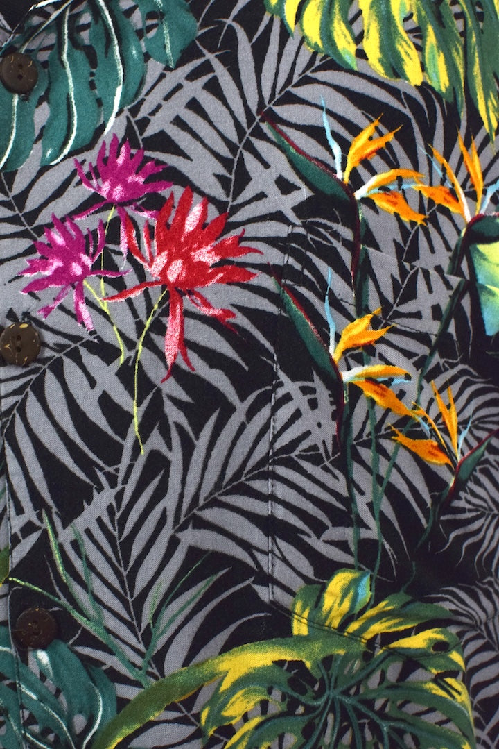 100% Rayon black short sleeve shirt with a colourful leaf, floral print