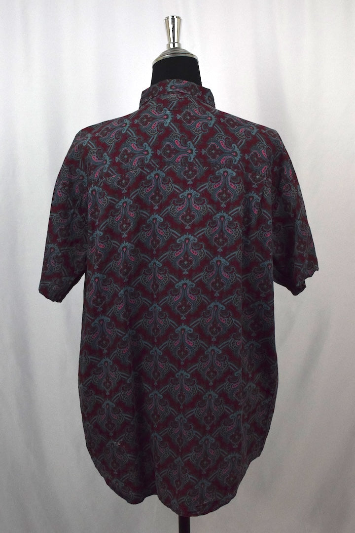 Red 100% cotton short sleeve shirt with a diamond leaf print