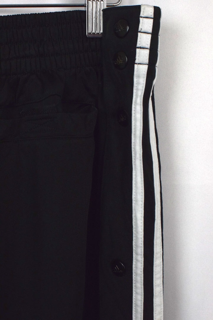 Black track pants with an Adidas motif to front left leg