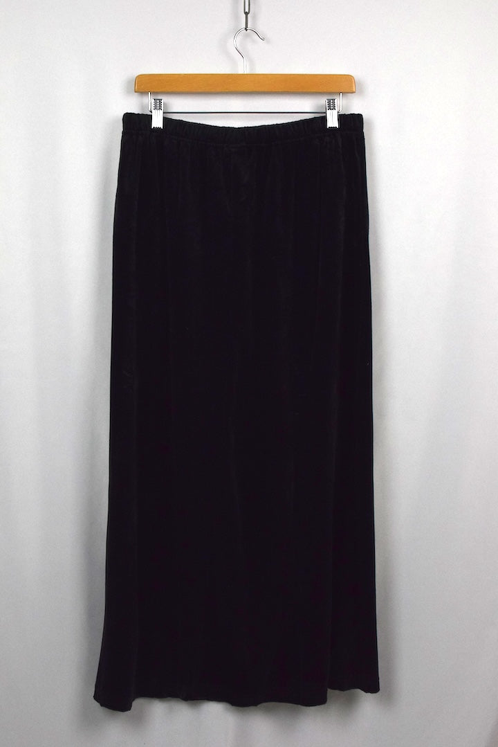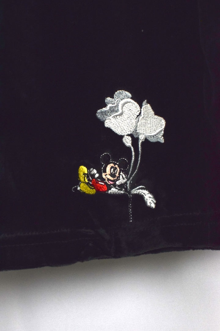 Black velvet maxi skirt with an embroidered Mickey Mouse motif to front