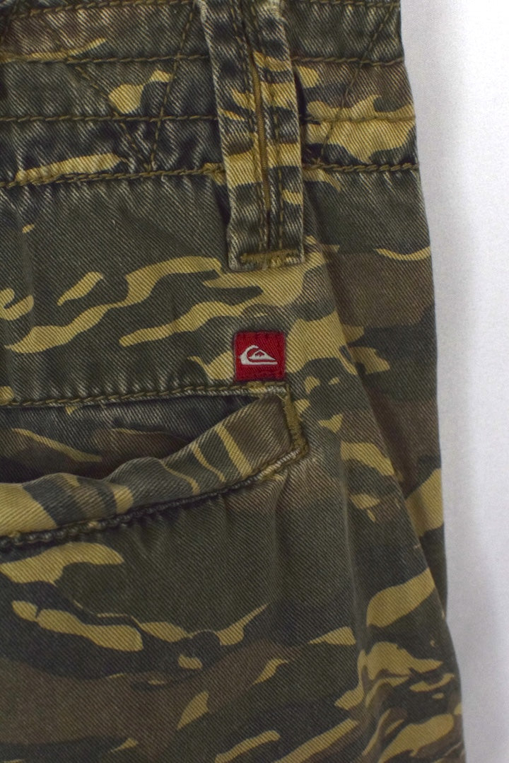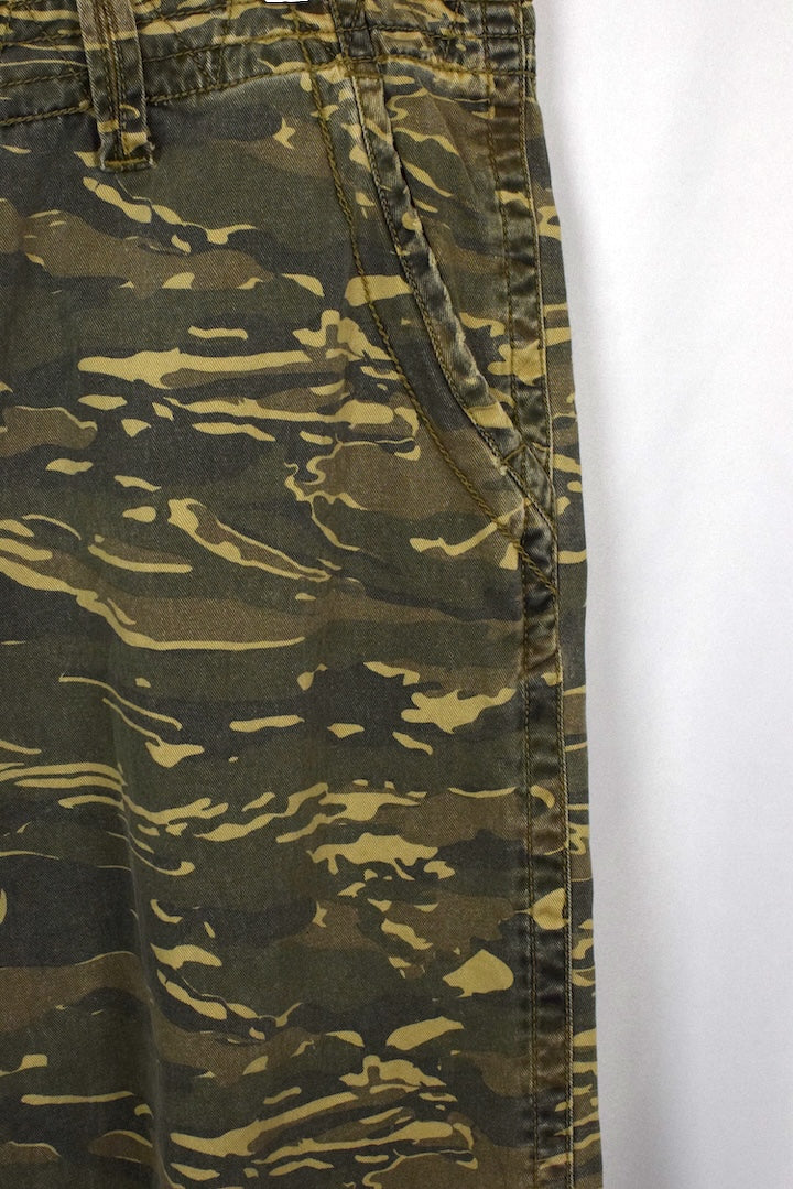 Green camouflage denim shorts with natural denim fading