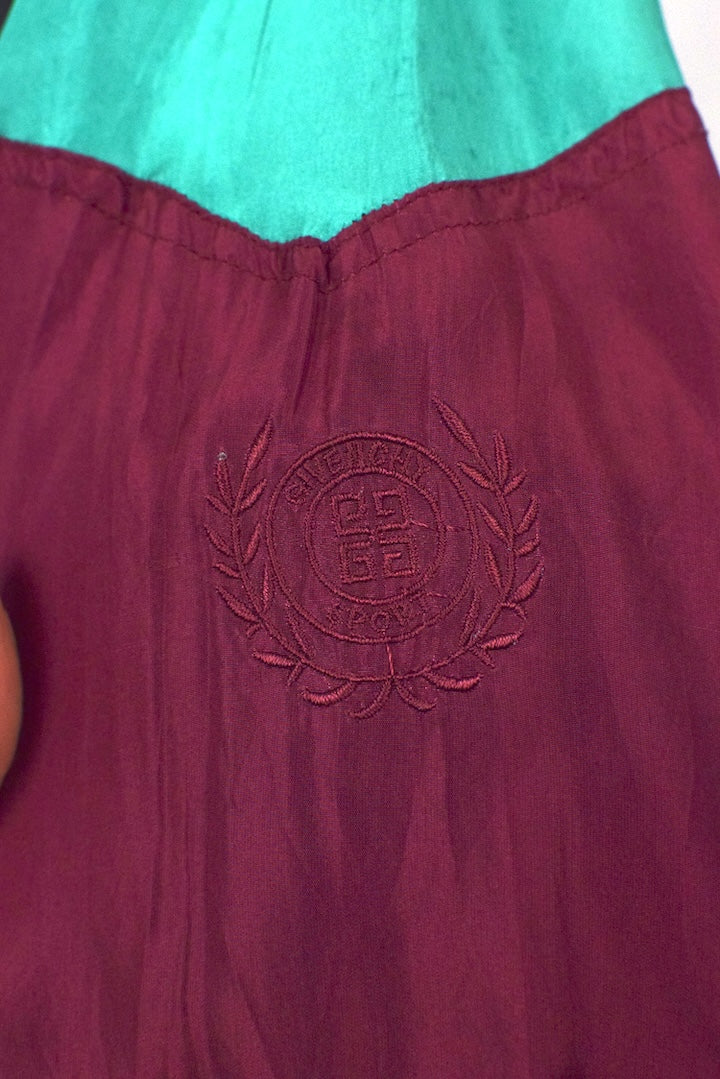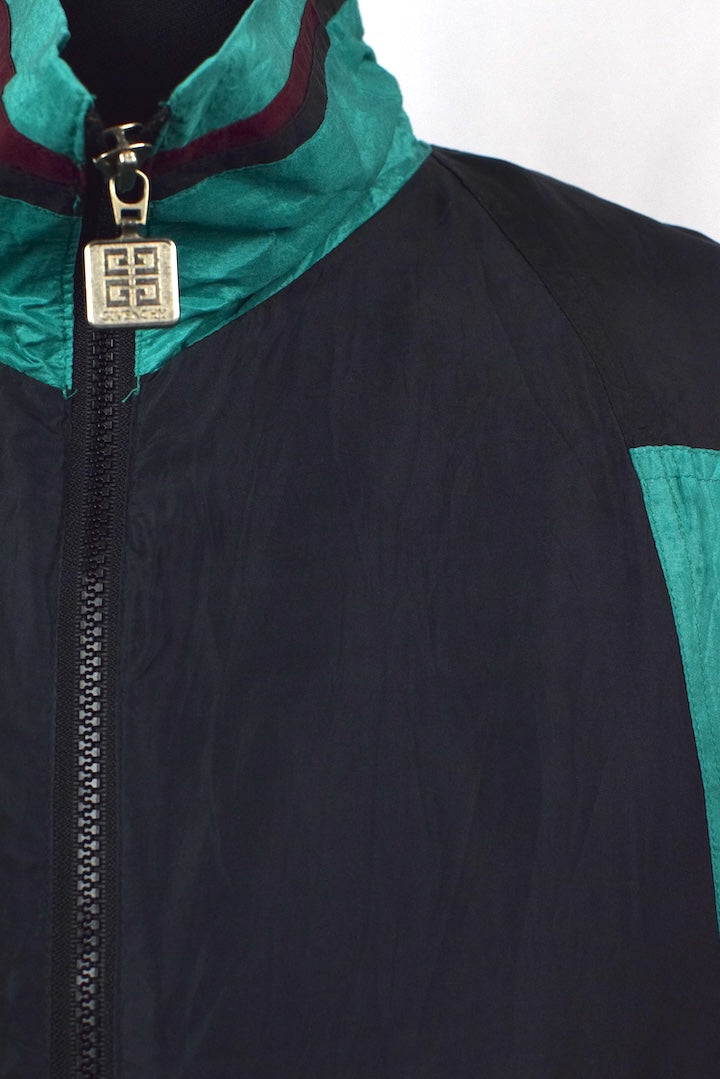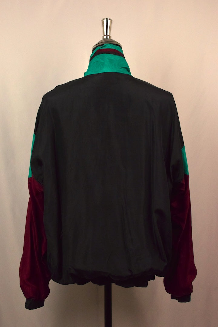 100% Silk black full zip spray jacket with maroon and green panels