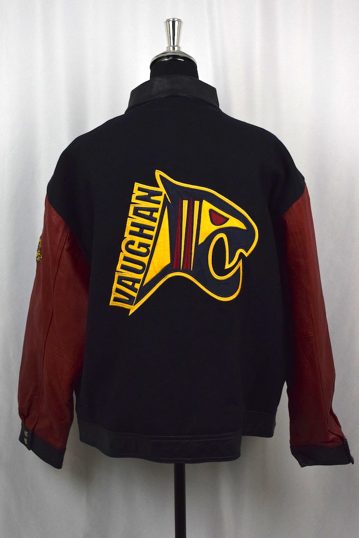 Wool mix blend navy full zip varsity jacket with red leather sleeves