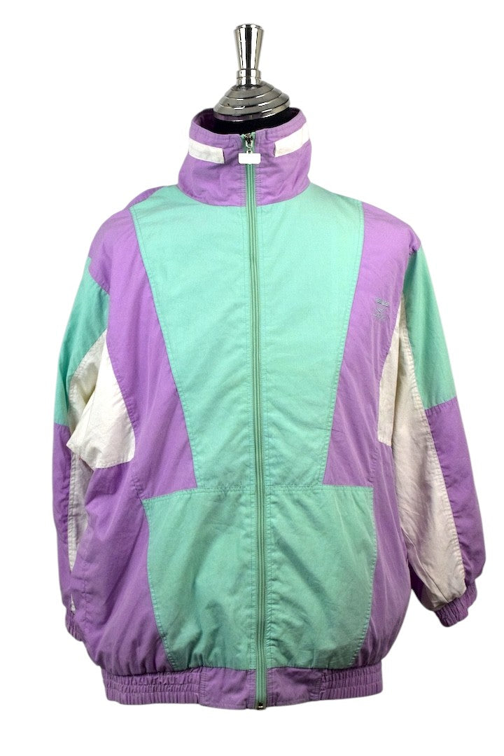Polyester/Cotton pastel purple full zip spray jacket with white and green panels