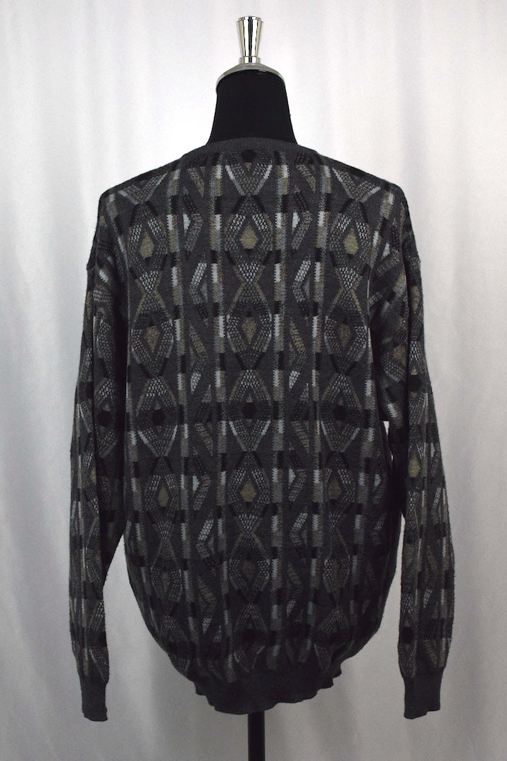 Wool/Acrylic blend grey knitted jumper with a multicoloured diamond, triangle striped pattern
