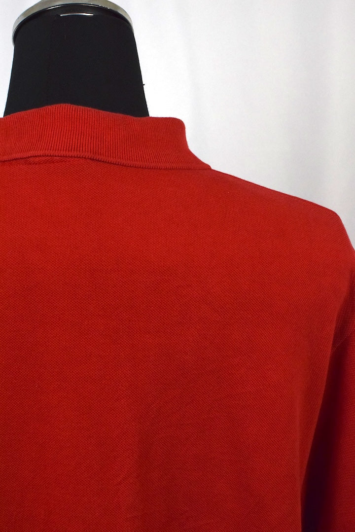 Red polo shirt with a Lacoste Crocodile patch motif to chest