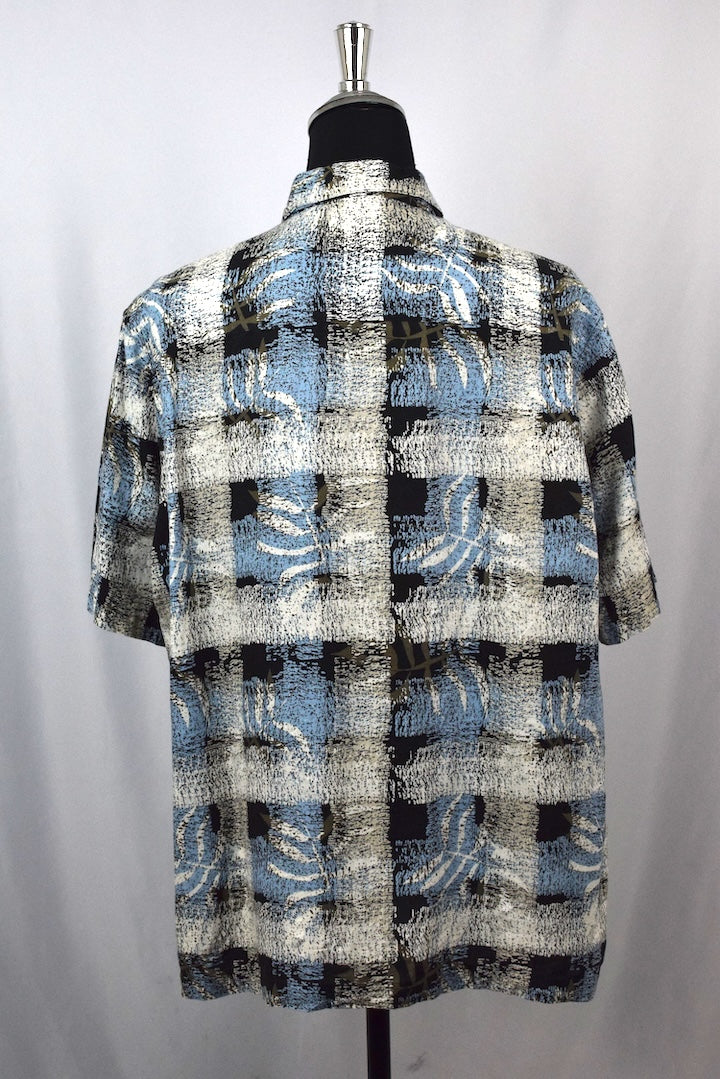 Linen/cotton blend shirt with square-atle abstract and leaf print all over