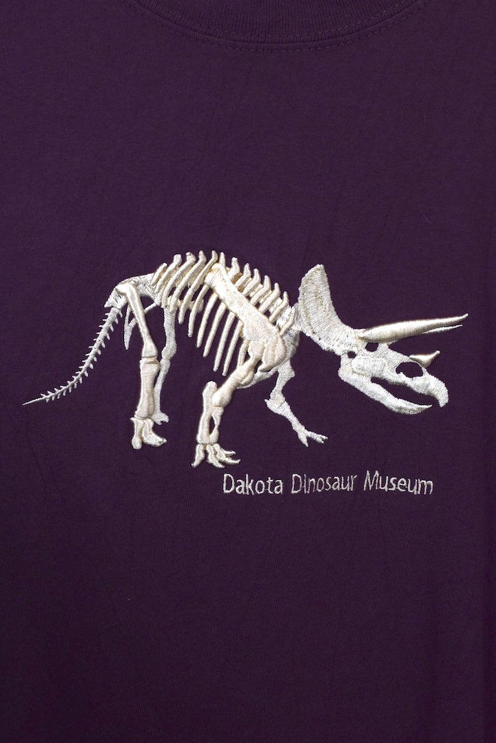 Purple t-shirt with an embroided Triceratops skeleton motif to front