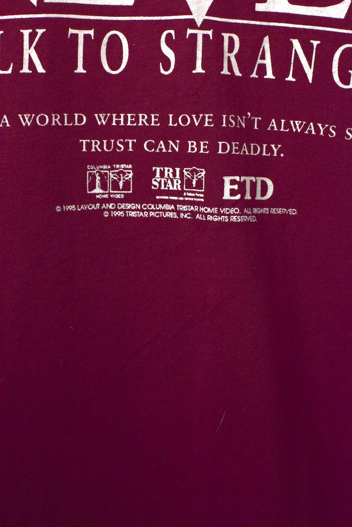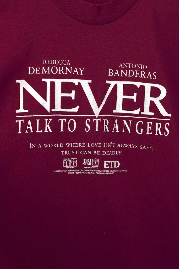 Red t-shirt with Never Talk to Stangers, Rebecca De Mornay, Antonio Banderas motif to front