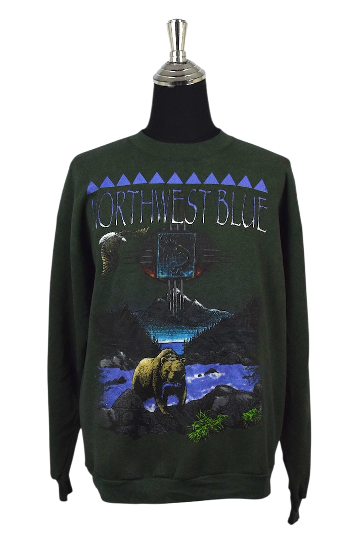 Green sweatshirt with Grizzly bear, Eagle, mountain landscape motif to front