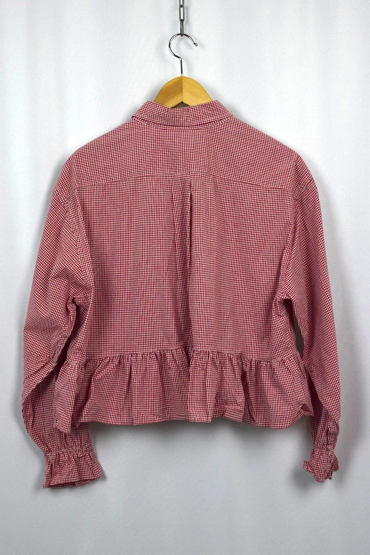 100% Cotton red top with a white checkered pattern and a frill hem