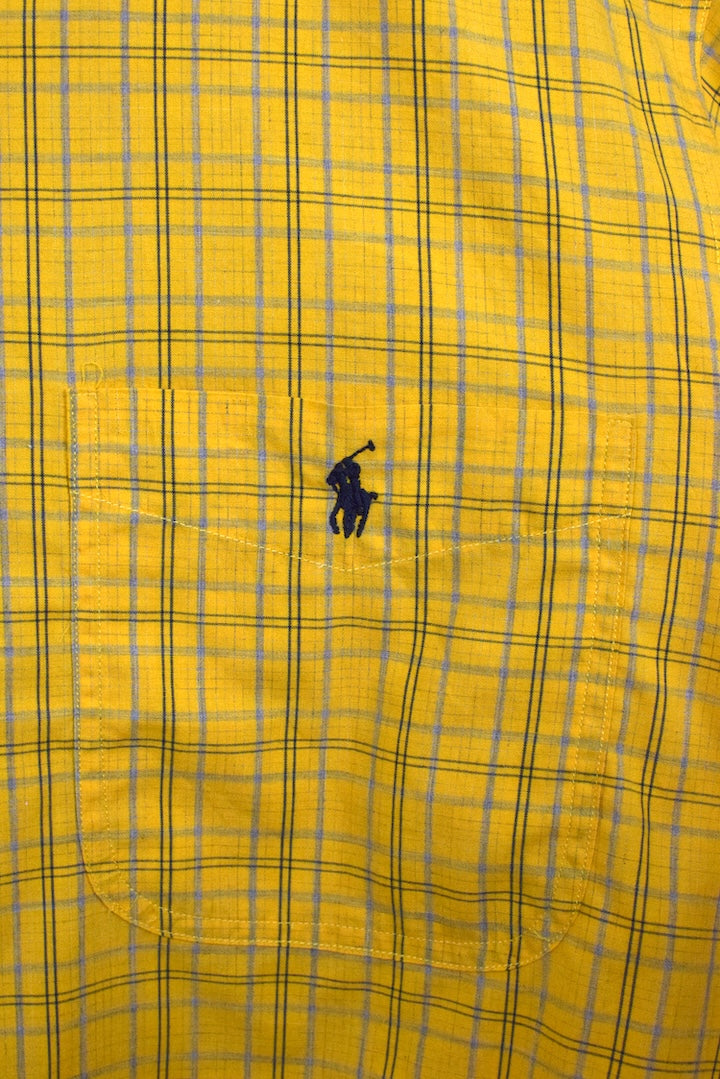 Yellow 100% cotton top with a multicoloured checkered pattern and a frill hem