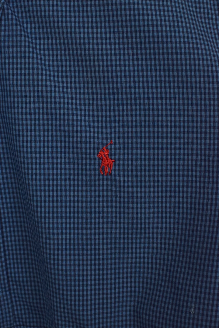 Blue 100% cotton top with navy checkered pattern and a frill hem