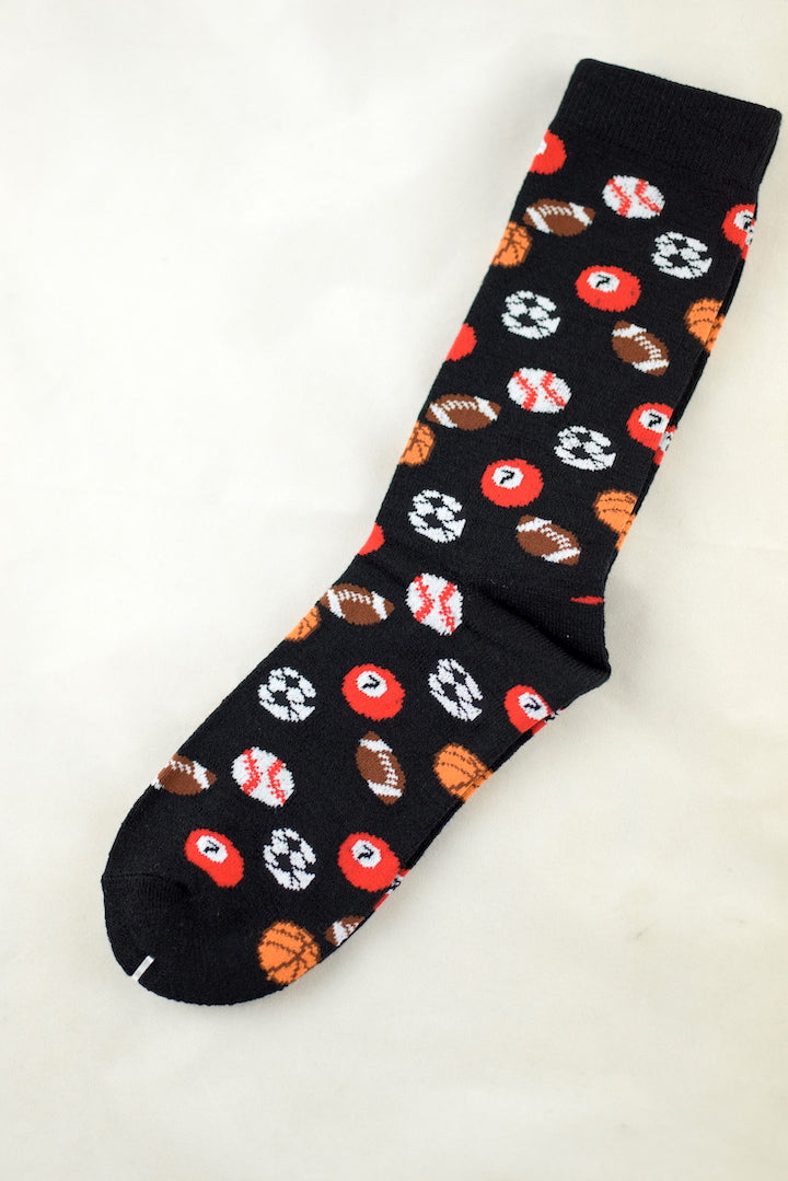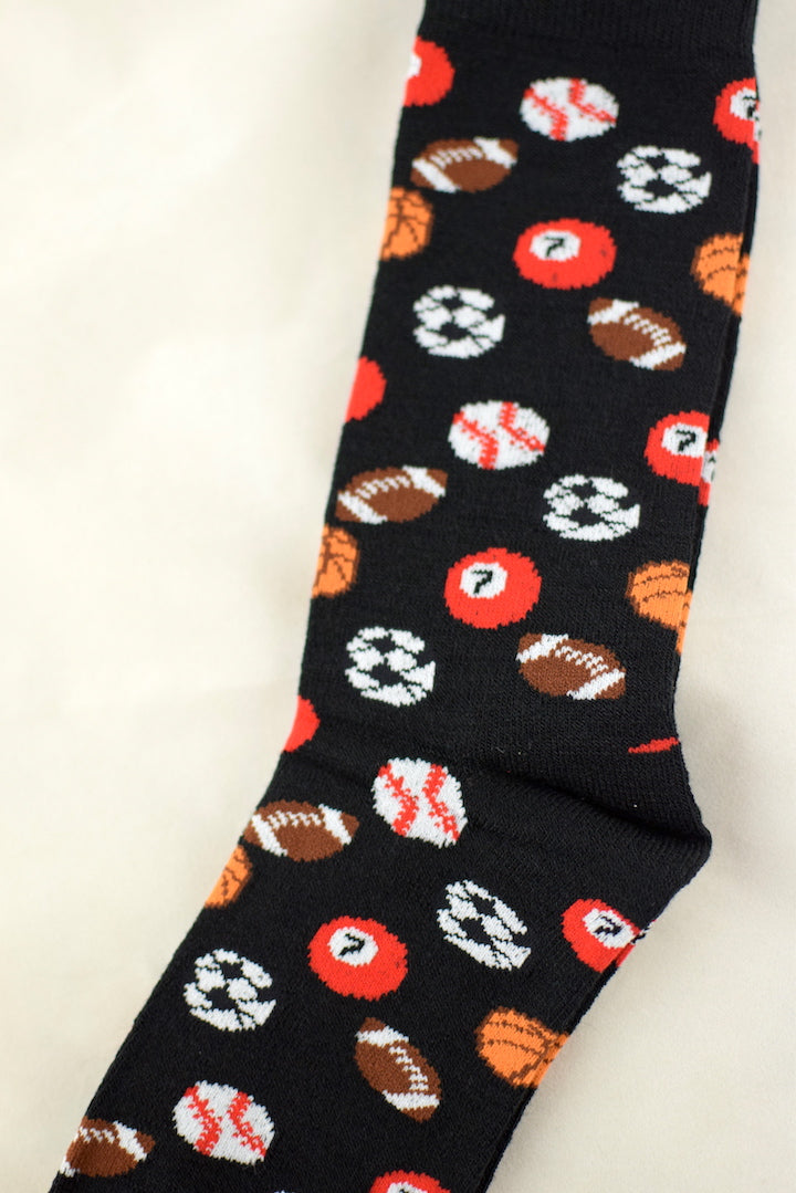 Black socks with different sports balls all over
