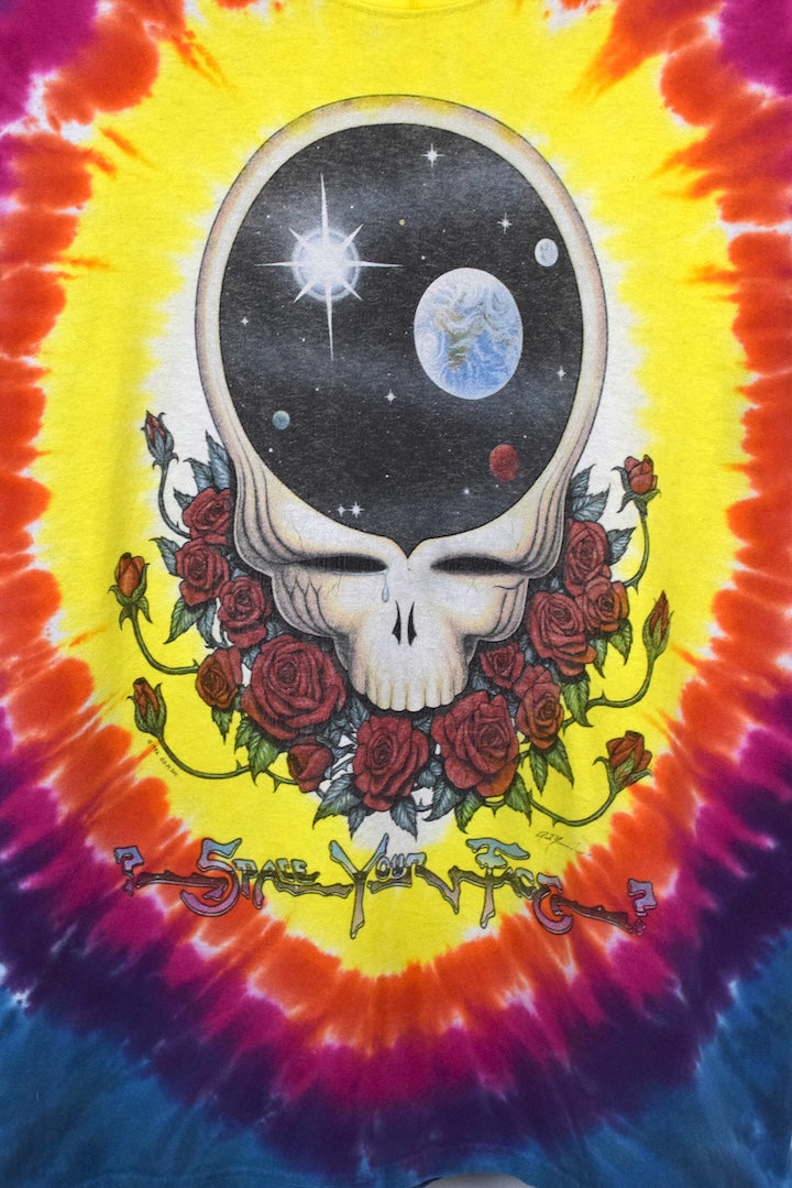 Rainbow tie-dye t-shirt with Skull, roses, Space Your Face motif to front