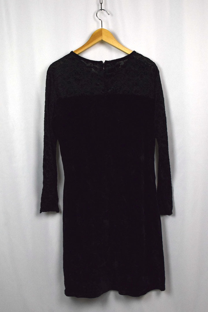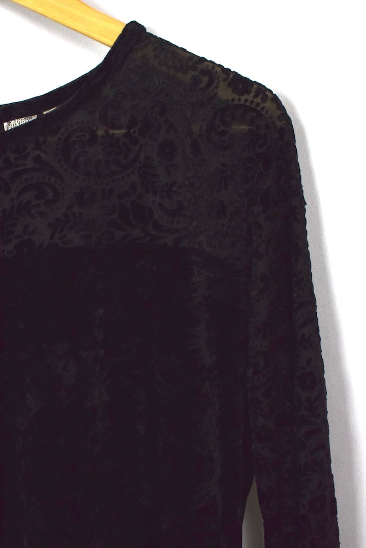 Black long sleeve velvet dress with a mesh and paisley pattern