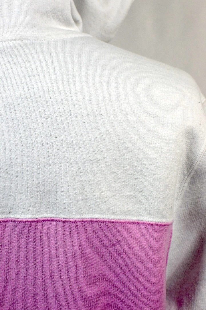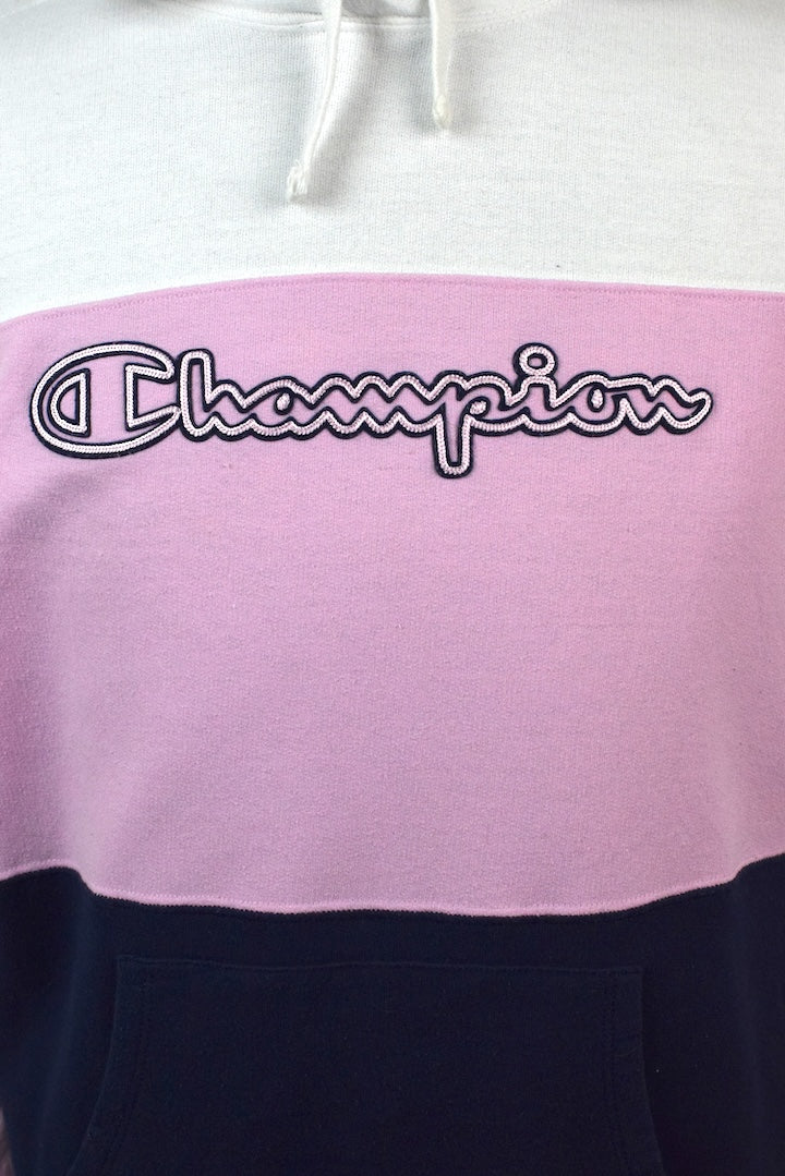 White, pink and navy hoodie with an embroidered Champion motif to front