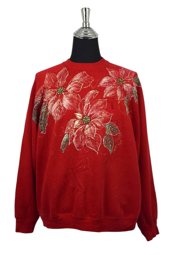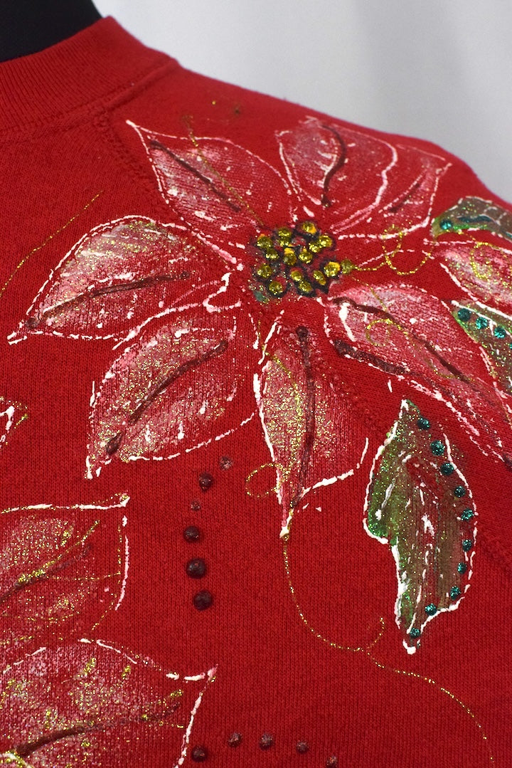 Red sweatshirt with a hand painted poinsettia motif to front