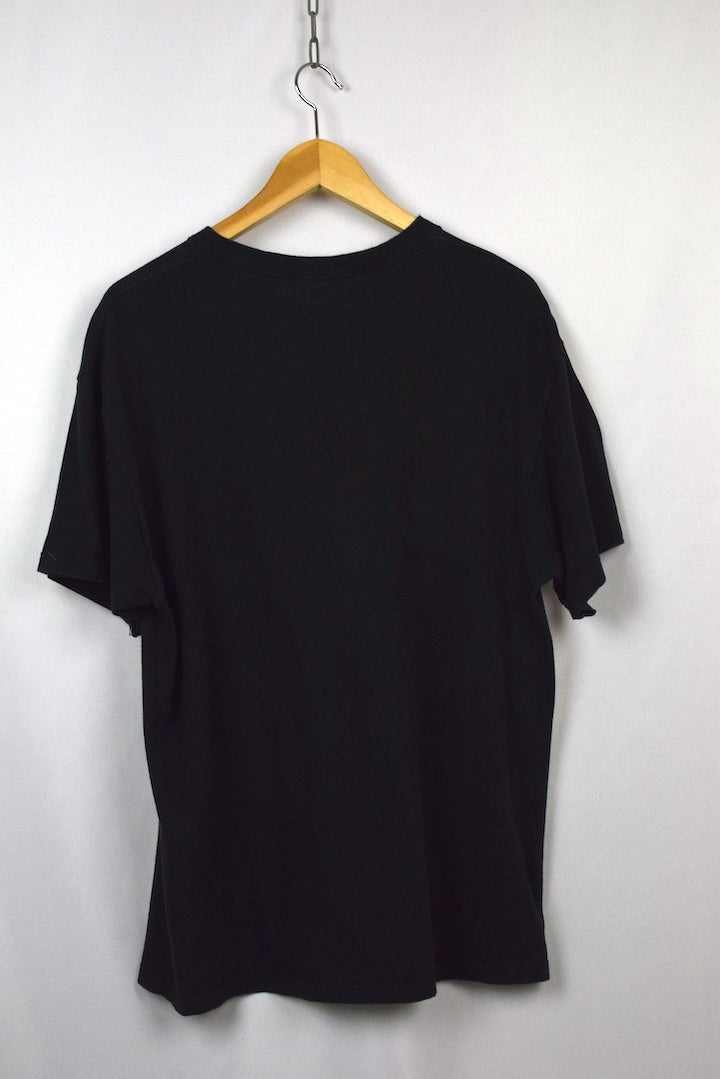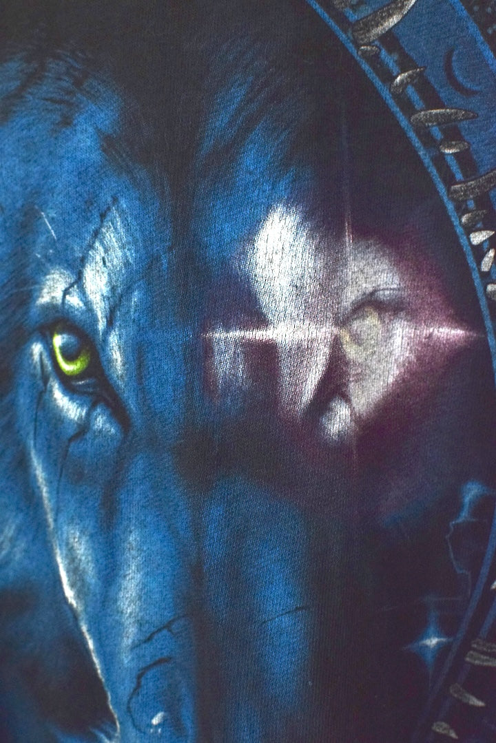 Lightly faded black t-shirt with Wolf, Magic circle and moon motif to front
