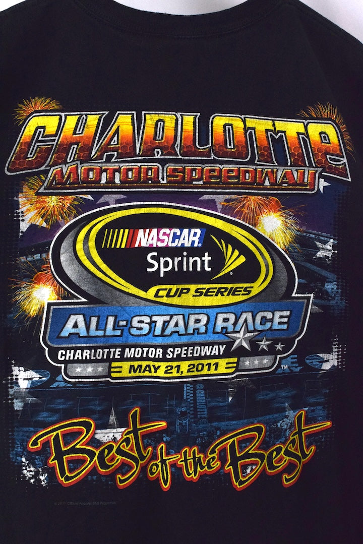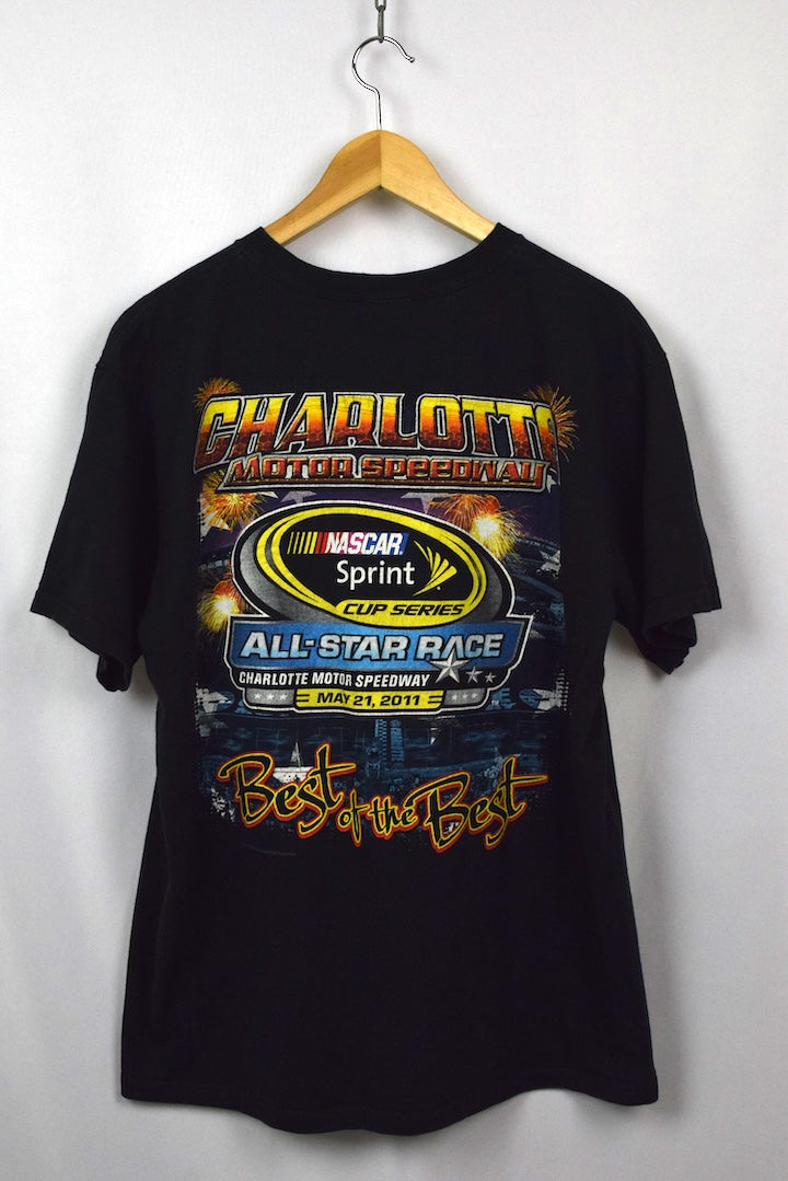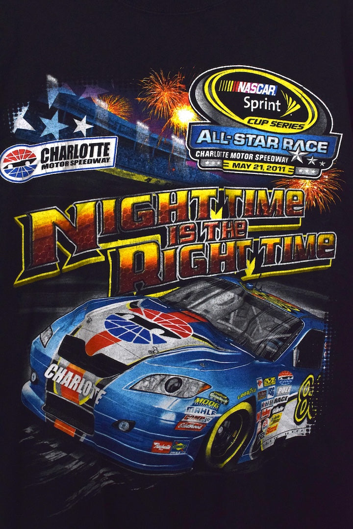 Black t-shirt with Charlottle Motor Speedway, Race car, Night Time Is The Right Time motif to front