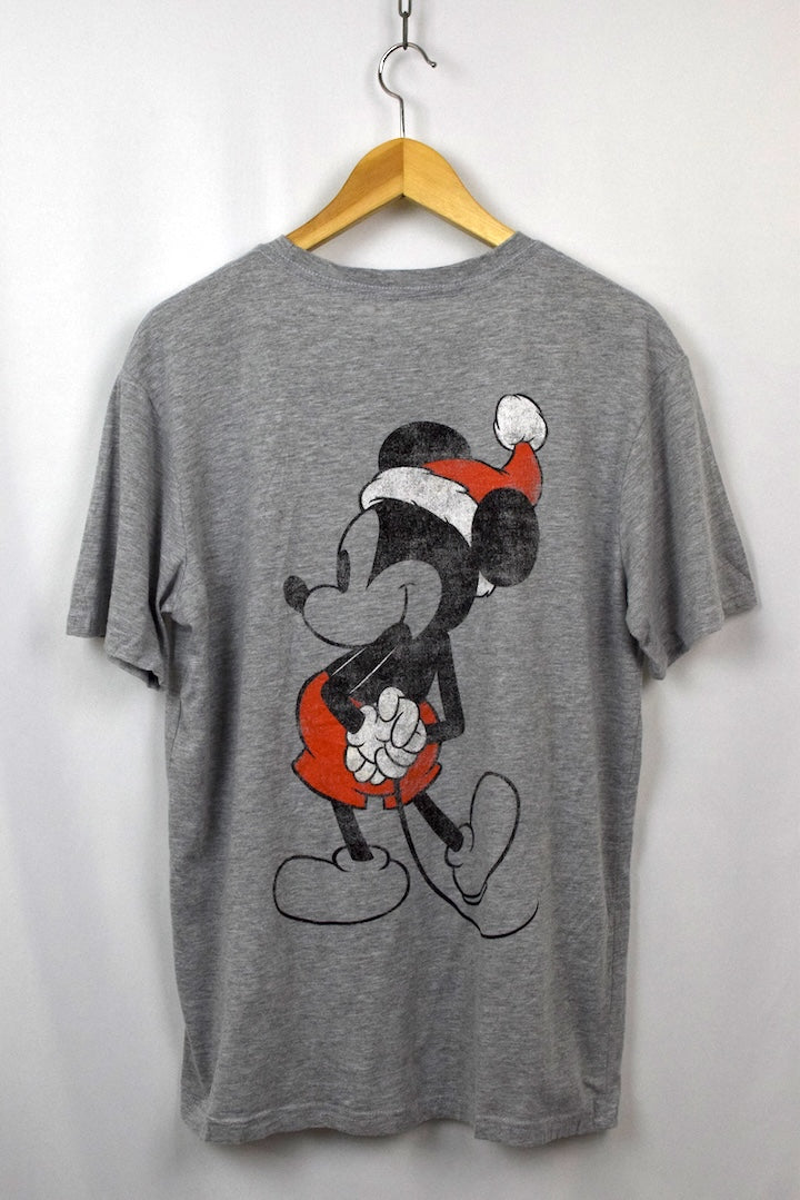 Mottled grey t-shirt with a vintage/worn style Mickey Mouse in a Santa hat motif to front