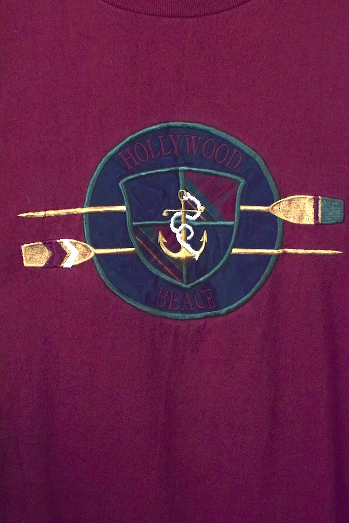Red t-shirt with an embroidered Hollywood Beach, Oars motif to front