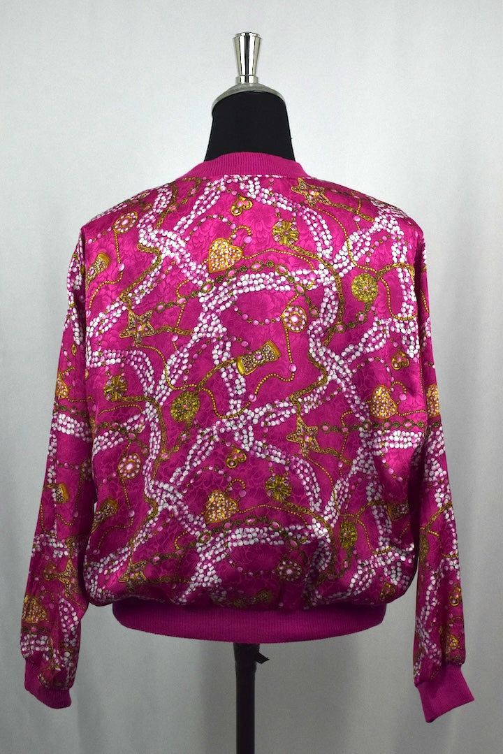 100% Polyester pink lightweight full zip spray jacket with pearls and multiple different jewellery print