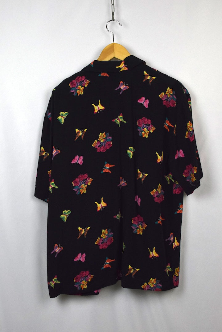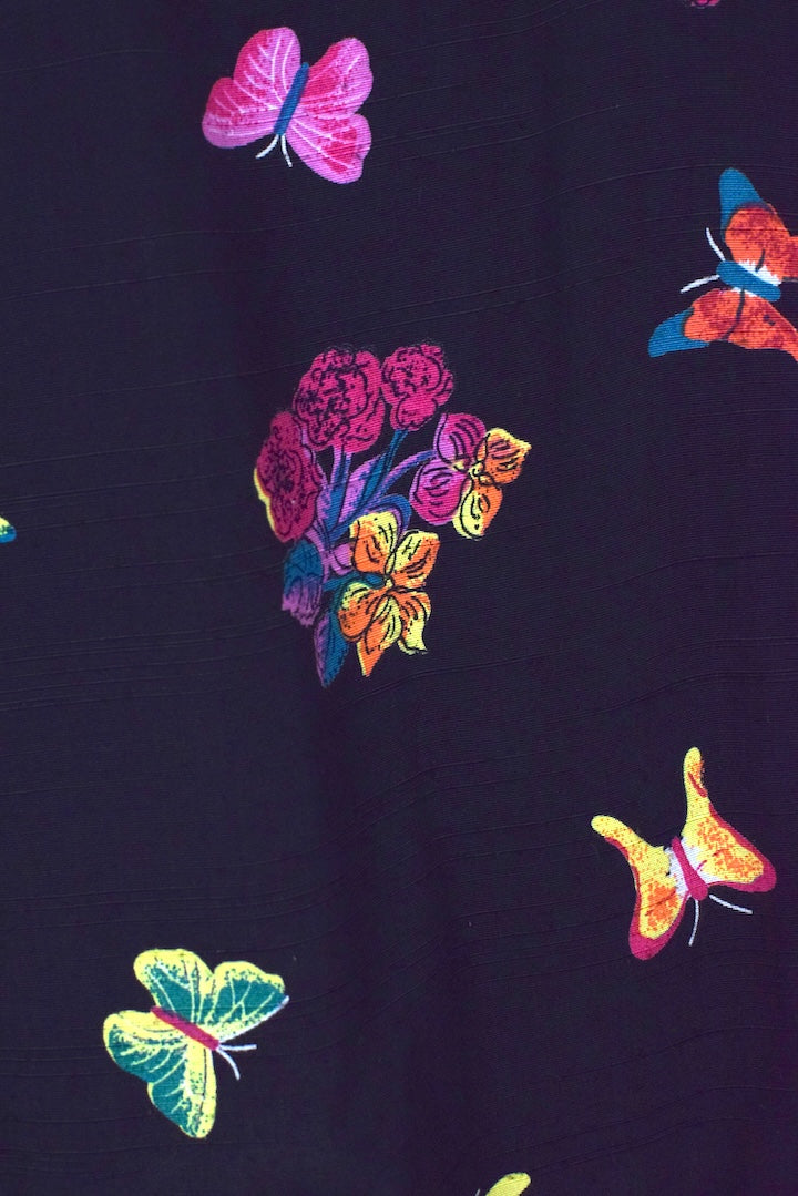 Black shortsleeve blouse with a colourful butterfly, floral print