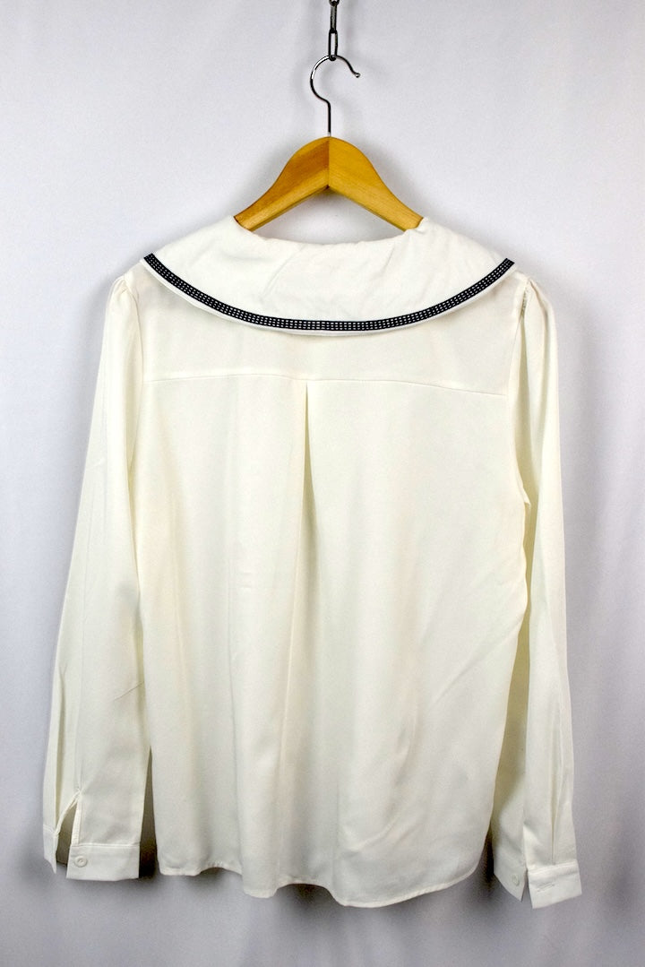 White blouse with an embroidered square pattern to peter pan collar