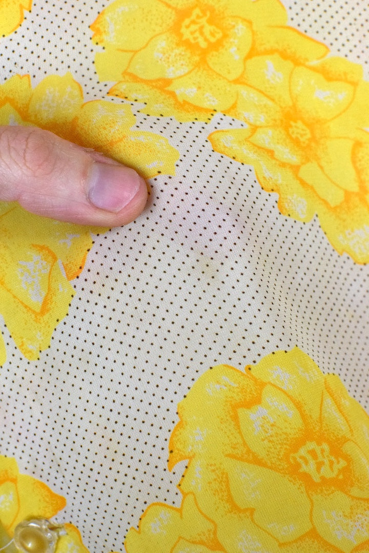 White blouse with black dot pattern and yellow rose print