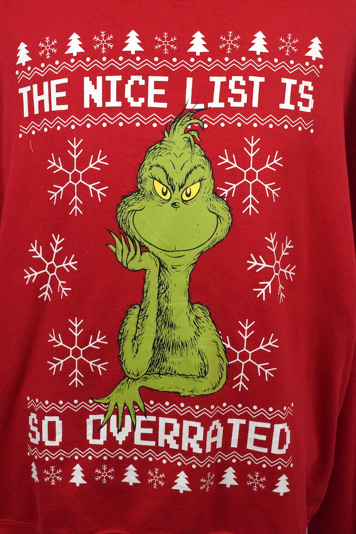 Red sweatshirt with The Grinch, The nice list is so overrated motif to front