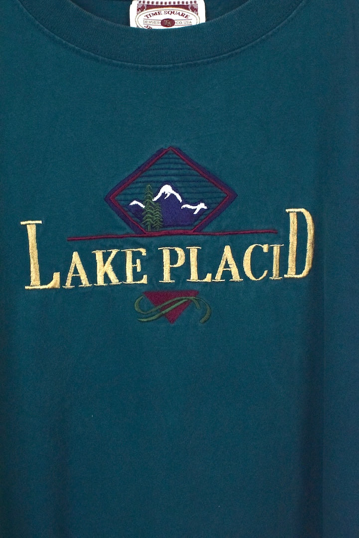 Teal t-shirt with an embroidered Mountain, Lake Placid motif to front