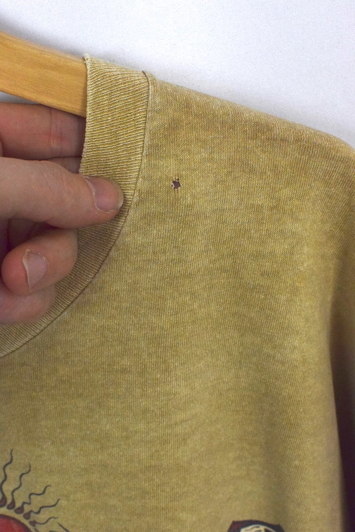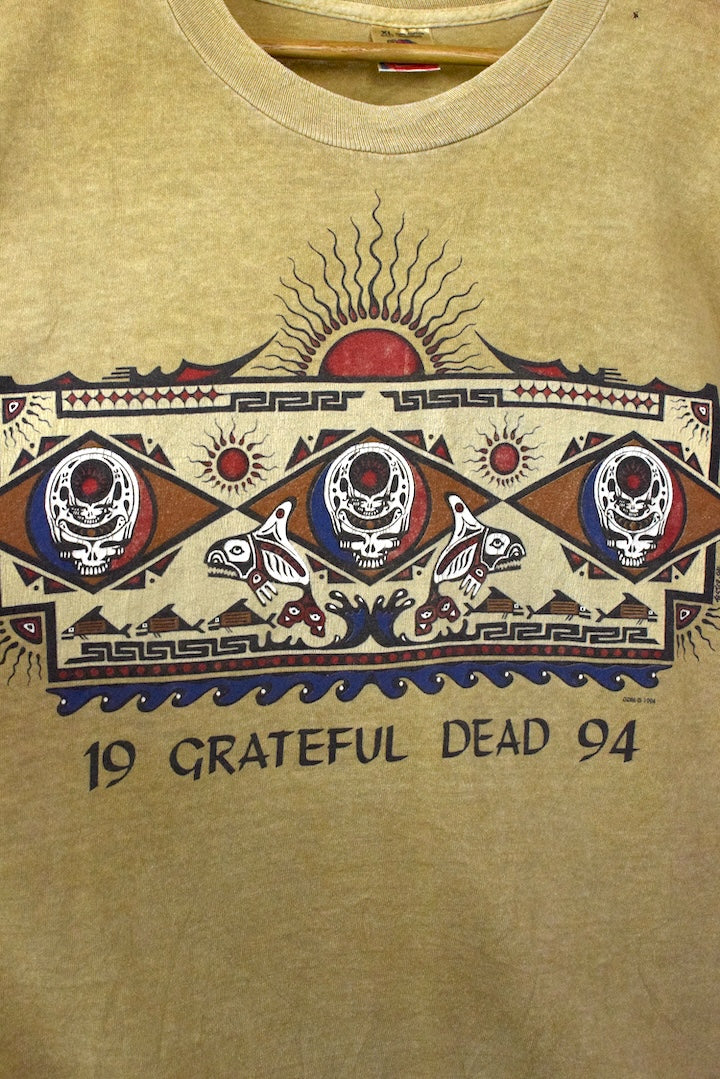 Mottled biege t-shirt with Grateful Dead skull and an aztec style board motif to front