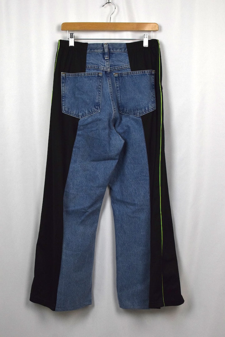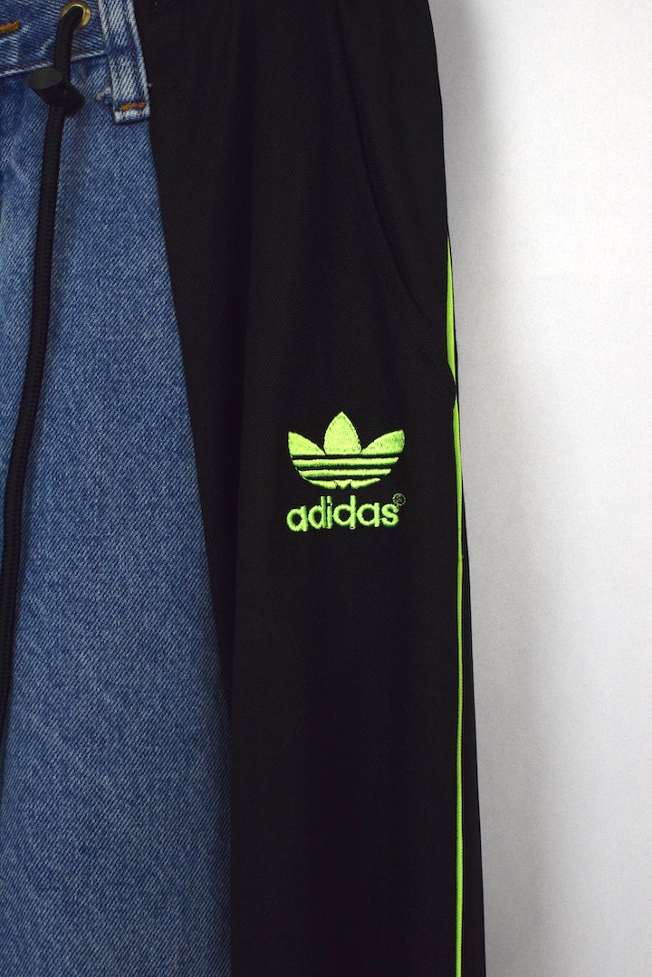 Denim jeans with natural denim fading, Original black Adidas track pants with yellow trim to sides