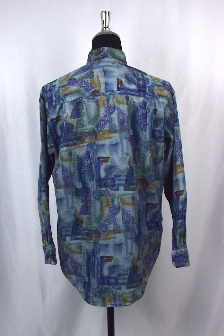 Blue shirt with an abstract multicoloured pattern and an all over statue and leaf print