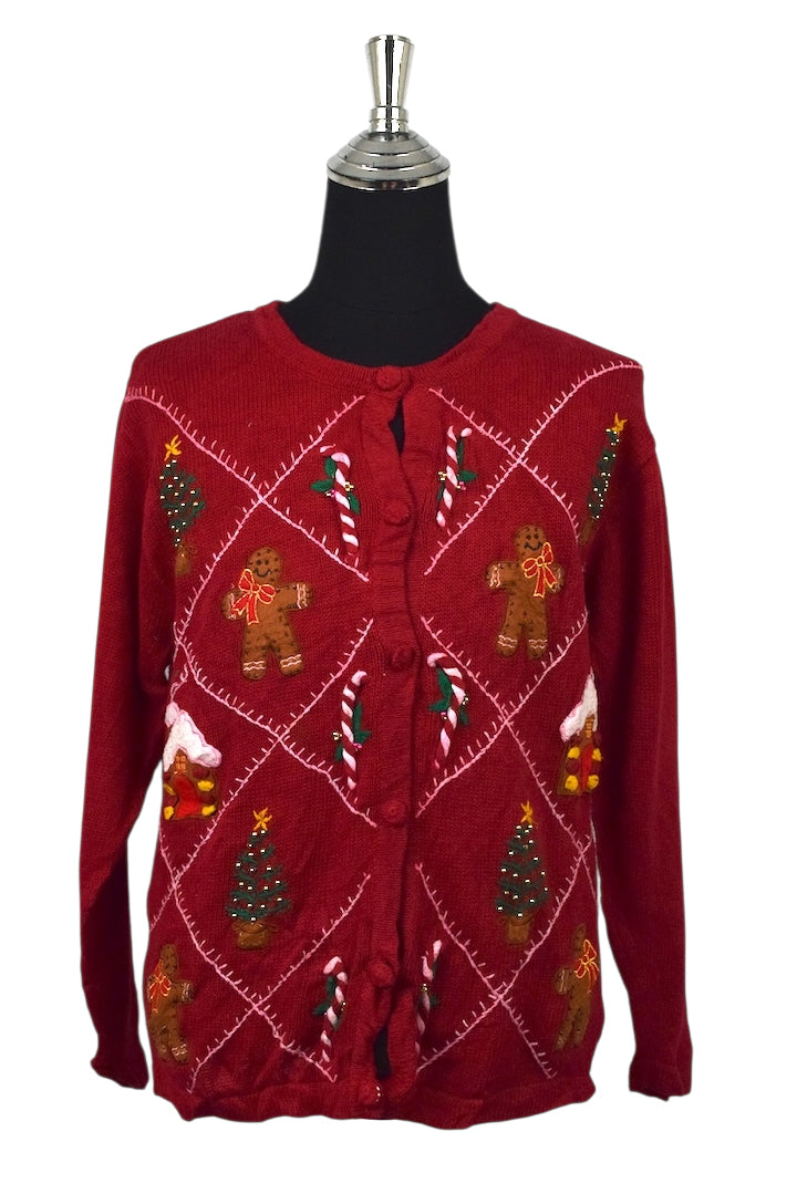 Multiple felt, gingerbread men, a christmas trees, a gingerbread house motif to front