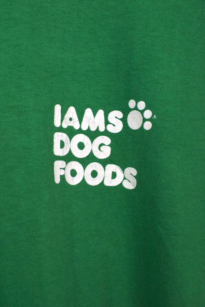 Green t-shirt with an IAMS Dog Foods, Paw Print motif to chest
