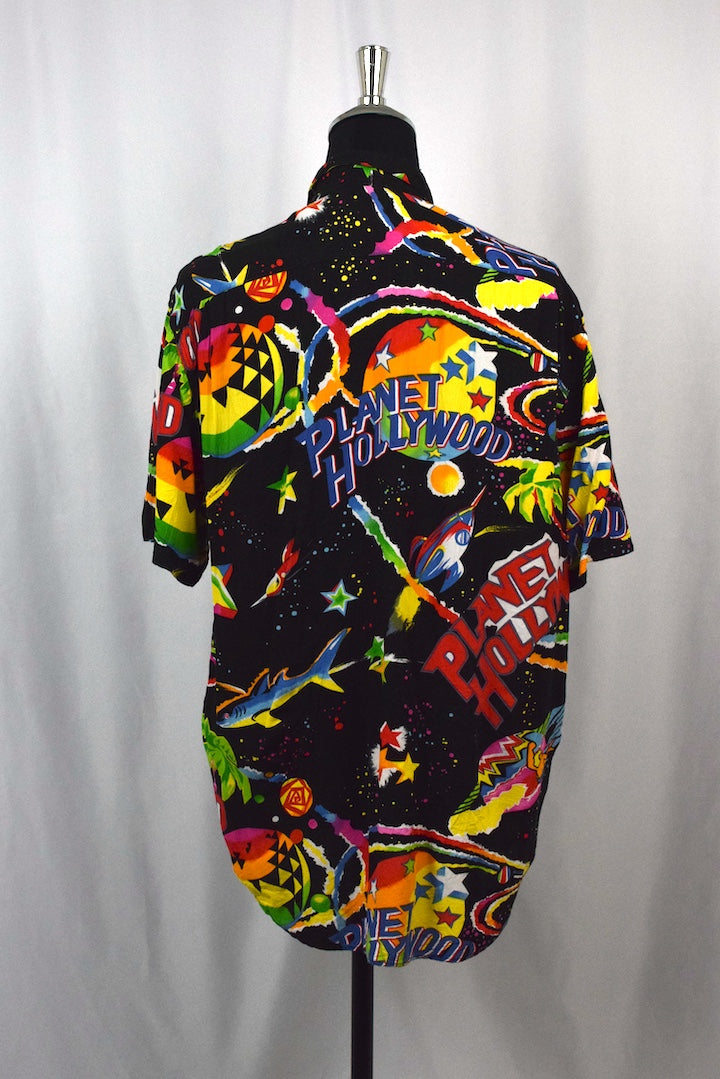 Black short sleeve shirt with a vibrant Planet Hollywood, Surfer, Planets motif